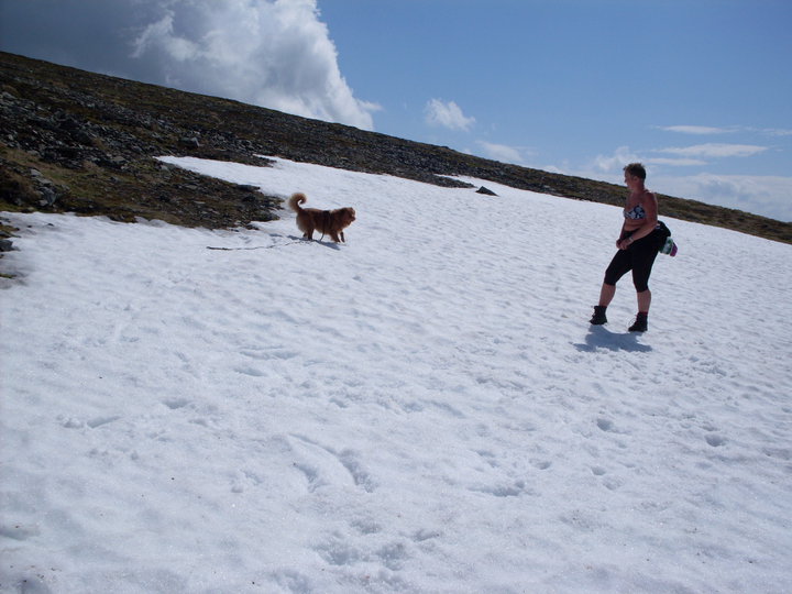 Ja, her bars det oppover og opp. Svetten silrant og væsket tapet stort, men jeg var mer bekymret for hunden. Det var lite vatn å finne, så jeg spruta vann inn i munnen på han. Det var så varmt til han at han prøvde å grave ei grop i bakken for å få avkjølt seg. Og gjett om han var glad da vi kom opp i snøen!